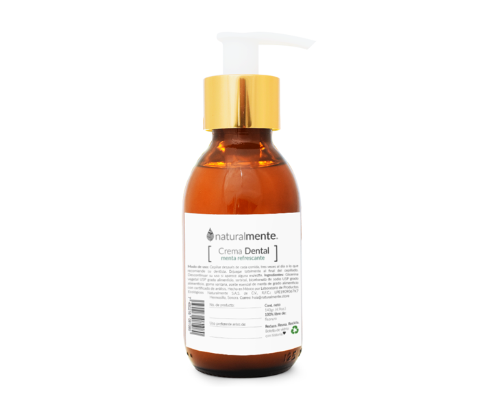 Descripción: La crema dental de Naturalmente está elaborada 100% de ingredientes naturales. 100% libre de fluoruro, alcohol, colorantes y conservadores artificiales. Utilizamos aceite esencial de menta 100% natural para eliminar el mal olor y mantener tu aliento fresco.