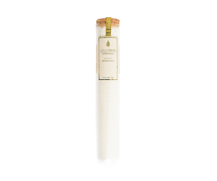 Descripción: La mascarilla de arcilla blanca tiene efectos desintoxicantes ya que cuenta con propiedades absorbentes. Tiene un pH 5, lo que la hace más aceptable para varios tipos de piel. Debido a su contenido de aluminio es un cicatrizante natural. Tiene propiedades exfoliantes y también se utiliza como auxiliar para alopecia, quemaduras, queloides y seborrea.Presentación comercial: Envase 100% ecológico. Tubo de vidrio con corcho natural.